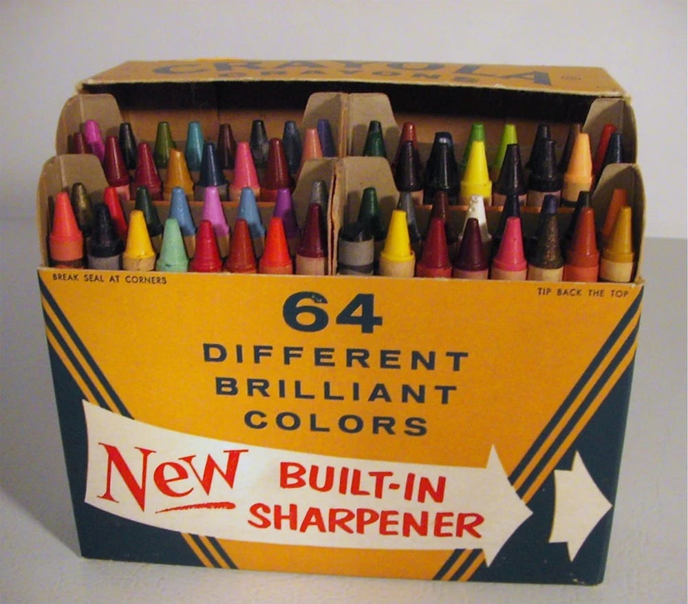 The super-big, fat box of crayons came out in 1958, and, wow! it even had its own built-in sharpener. It also had a fancy, flip-open lid, which really impressed me.